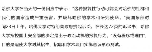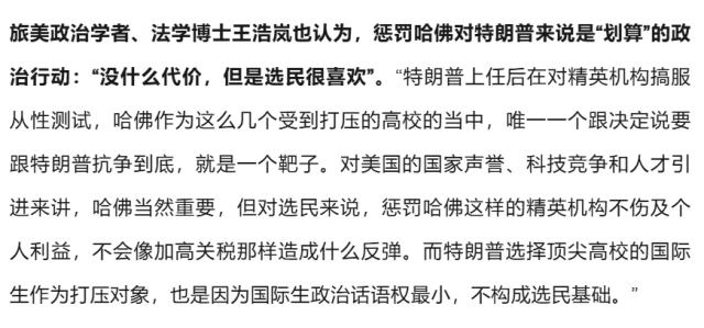 “第二,从特朗普个人的工作方式来看,他尊重强人的政治,不允许他的权威受到挑战。哈佛在美国大学中占据领先地位,所以对于特朗普来说,他希望能以身作则,整顿最不听话的学校。”陈征说。