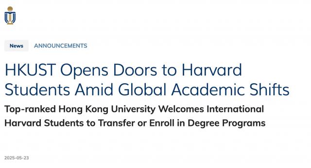 当美国赶走国际学生时, 月 23 香港科技大学宣布,香港科技大学宣布无条件录取哈佛国际学生。欢迎他们加入香港科技大学继续学习,继续追求学术。这一举措旨在应对全球学术环境的变化,突出香港科技大学致力于营造多元化、国际化的学习氛围的承诺。