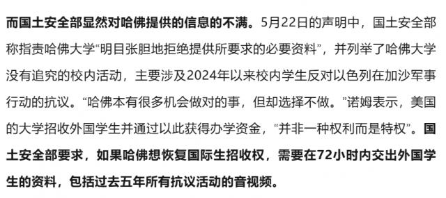 由于哈佛“助长暴力和反犹主义”,美国国土安全部部长诺姆宣布,他夺走了哈佛大学招收国际学生的权力。一个多月前,4 月 16 每天,诺姆都要求哈佛大学拿出所有外国学生的“非法和暴力活动”记录,并做好准备。 4 月 30 每天的截止日期,说哈佛如果不遵守执行,就要撤销其招收国际学生的资格。截至那天,哈佛大学执行副校梅雷迪思 · 威尼克(Meredith Weenick)发表了一封公开信,承诺学校只会向行政机关提供“法律要求”,并敦促学生“尽可能专注于自己的学术追求”。