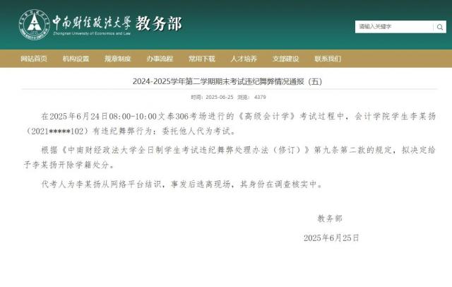 6 月 25 日,中南财经政法大学官网通报: 2025 年 6 月 24 日 08:00-10:00 文泰 306 会计学院学生李某扬(2021***102)在考场参加《高级会计学》考试时,有违纪行为:委托他人代为考试。