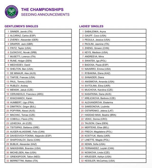 温网种子选手名单发布:辛纳萨巴伦卡领衔,郑钦文女单5号种子