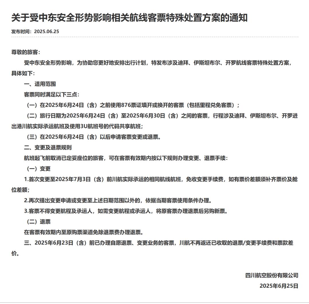 川航关于受中东安全形势影响的航道客票特殊处置方案的通知