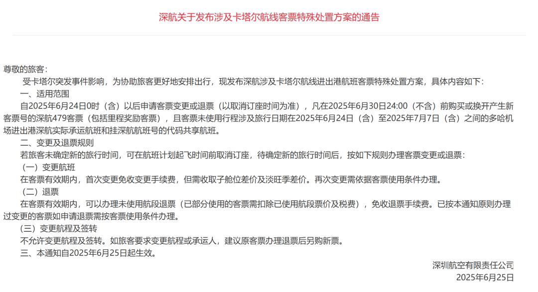 深航关于发布卡塔尔航线客票特殊处置方案的通知
