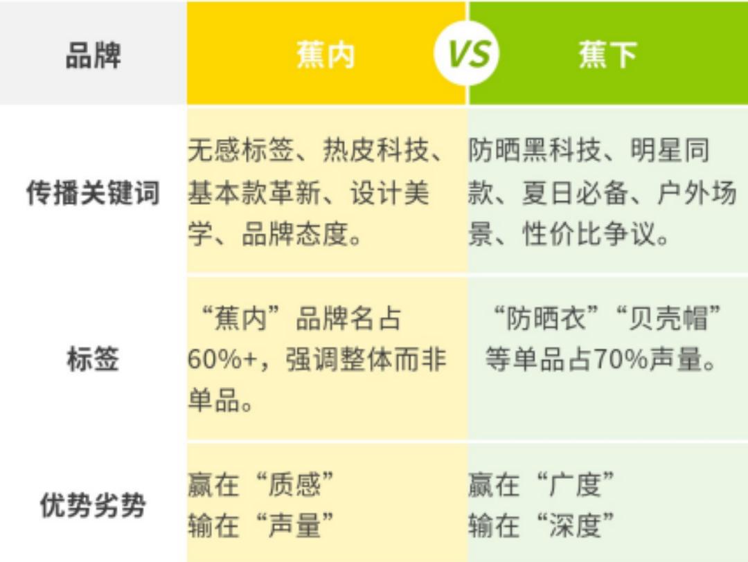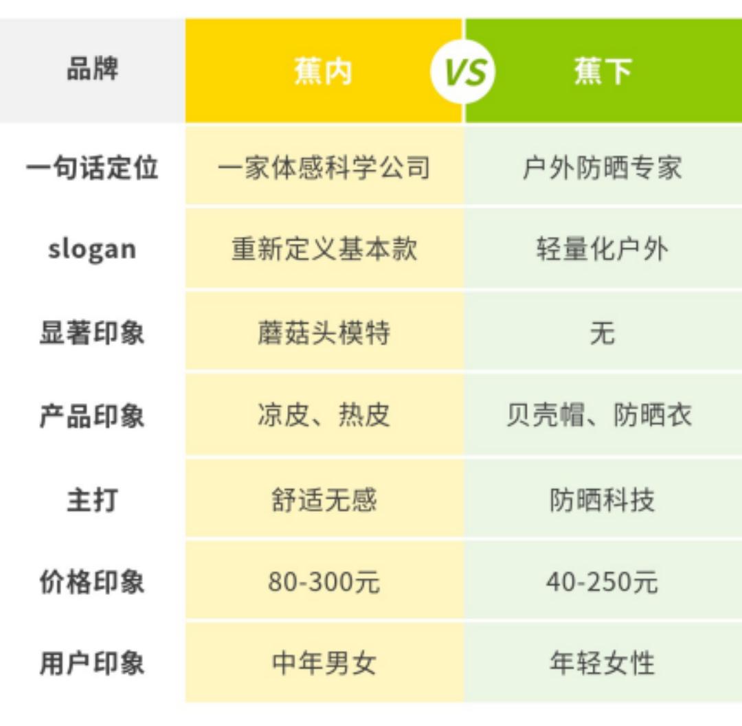 一开始和大多数人一样,只是觉得这两个品牌很像,都是服装类别,名字相似,产品相似。他们都是电商品牌,审美风格也很相似,经常让人“傻傻分不清”(我怀疑他们也把对方当作参考系)。关键是这两款产品在全网的知名度和水平都差不多,粉丝数量也是平等的,所以我强迫他们这样区分:香蕉里有个“内”字。这个和做内衣有关。香蕉下面是香蕉叶下面,所以它是做防晒产品的。