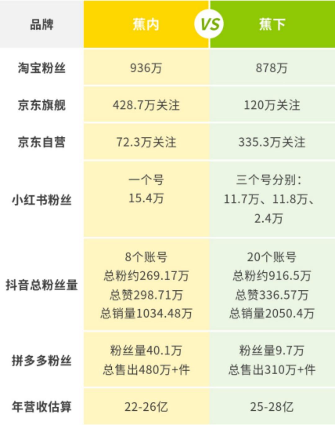 香蕉内容更受好评,收入转化率更高,说明内容质量投入更大,更受欢迎。香蕉下社会媒体的粉丝规模更大,说明引流动作越来越激进。进一步印证了第一印象是“从品牌开始做品牌”和“从营销开始做品牌”的区别。