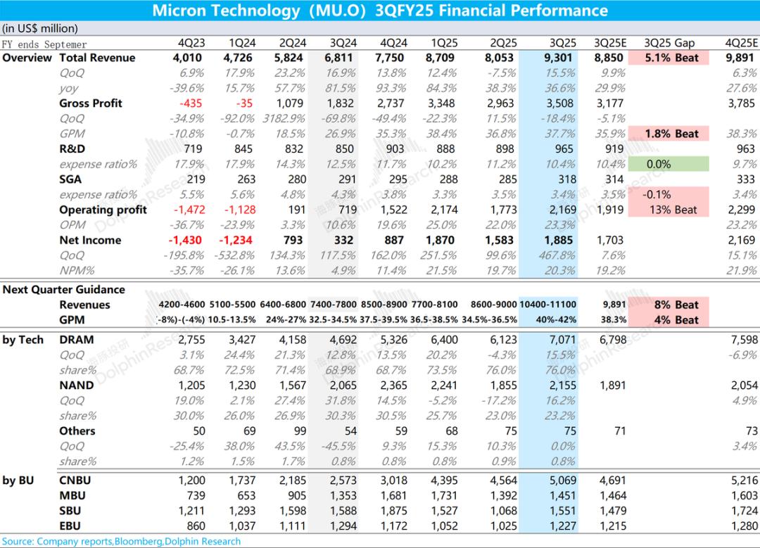 1.整体业绩:与市场预测(88.5亿美元)相比,美光本季度营收为93亿美元,环比增长15.5%,预期差距主要来自NAND出货量增长和HBM增长的推动。在这个季度,DRAM和NAND的平均价格仍在下降,但是两个出货量的环比增长率都达到了20%以上。