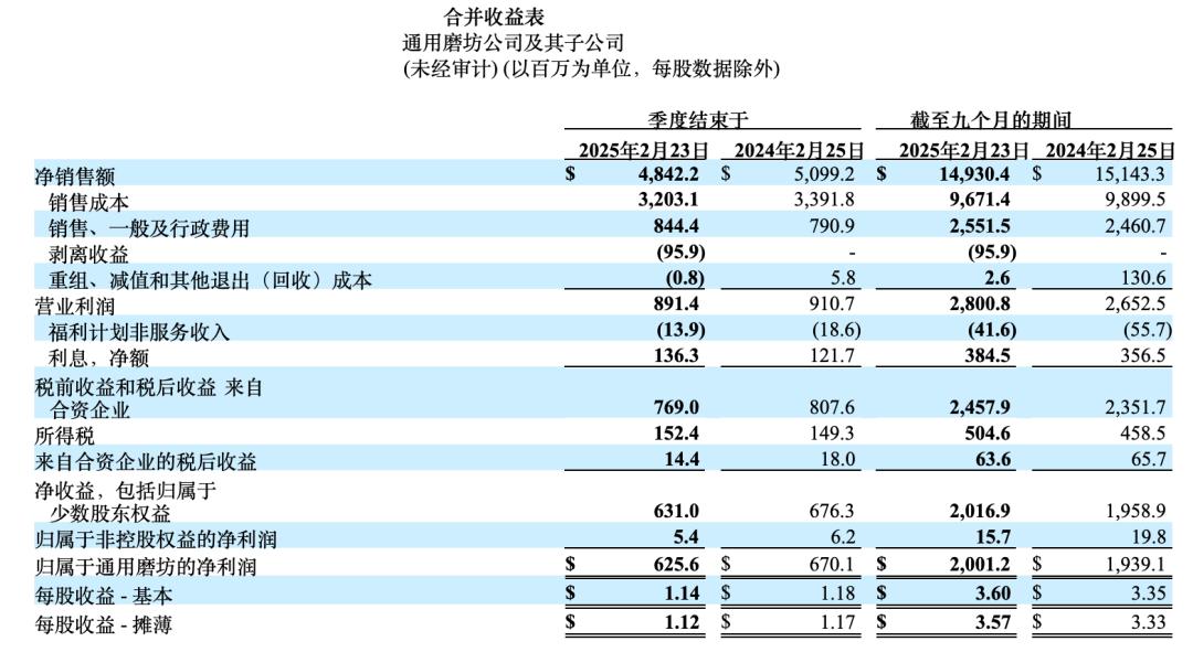 2025财年第三季度(截至2025年2月23日),通用磨坊净销售额为48亿美元,同比下降5%,其中中国市场净销售额同比下降3%;净利6.26亿美元,同比下降7%。该财季数据公布后,当日股价下跌超过2%,报告为59.215美元。