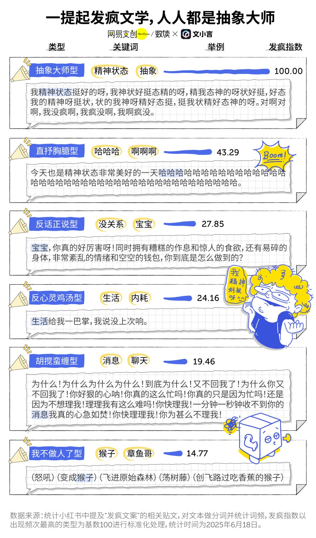 不久,这种疯狂的文学风靡全网,并在年轻人的实战中衍生出不同亚型的疯狂文学。