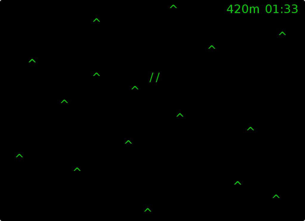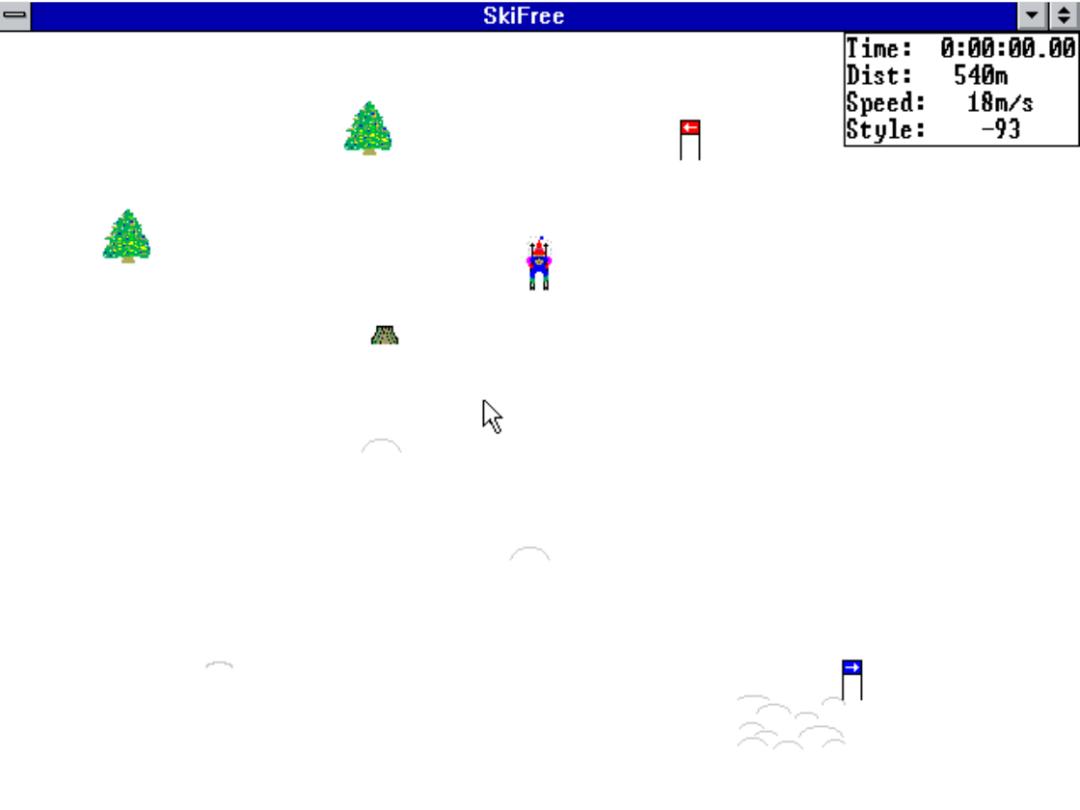 在 SkiFree 其中,玩家需要用键盘或鼠标来控制滑雪者穿过代表山坡上雪的白色背景。游戏包括三种模式:障碍、自由和树阻。目标是滑下无尽的陡坡,绕过障碍物(树、树桩、狗等)。).当玩家通过 2000 大米标记时,还会出现雪怪追逐玩家,追上时玩家就会被吃掉。