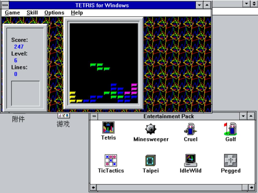 由于没有其它游戏公司的支持,Ryan 选择选择自己公司的公司。 Windows 团队成员,在业余时间开发俄罗斯方块等一系列游戏(Tetris)、TicTactics(三维井字棋)等等。除了游戏,微软还增加了一些屏幕保护程序。
