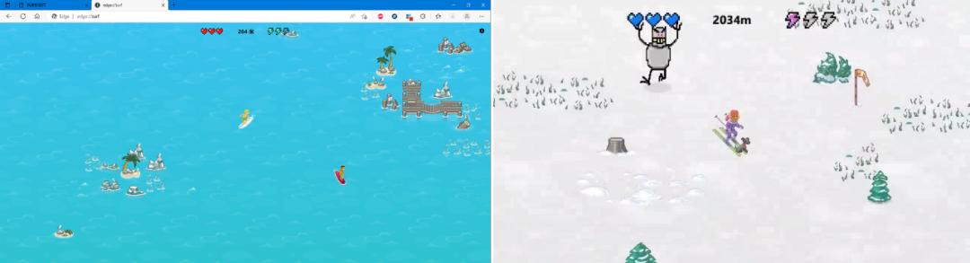 三十年后,当微软计划是 Edge 当浏览器添加游戏特色时,微软想到了它。最终微软推出了名字「Edge Surf」新游戏,供用户使用 Edge 断开网络连接时玩(和 Chrome 类似于小恐龙),或者可以直接输入 edge://surf 游玩。这款游戏除了改为水上冲浪的背景(和「网上冲浪」除了呼应),玩法和画风 SkiFree 基本一致。后来微软更是设计了冬季主题,将背景改为滑雪,以致敬 SkiFree。