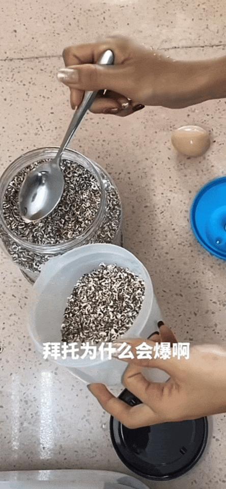 在视频中,我看到“厚橘子”把两勺看起来像螺丝钉的黑燕麦倒进碗里,直接打了一个鸡蛋,然后加入半碗冷水放入微波炉加热。加热后,加入牛奶和坚果,这个燕麦蛋碗就完成了。
