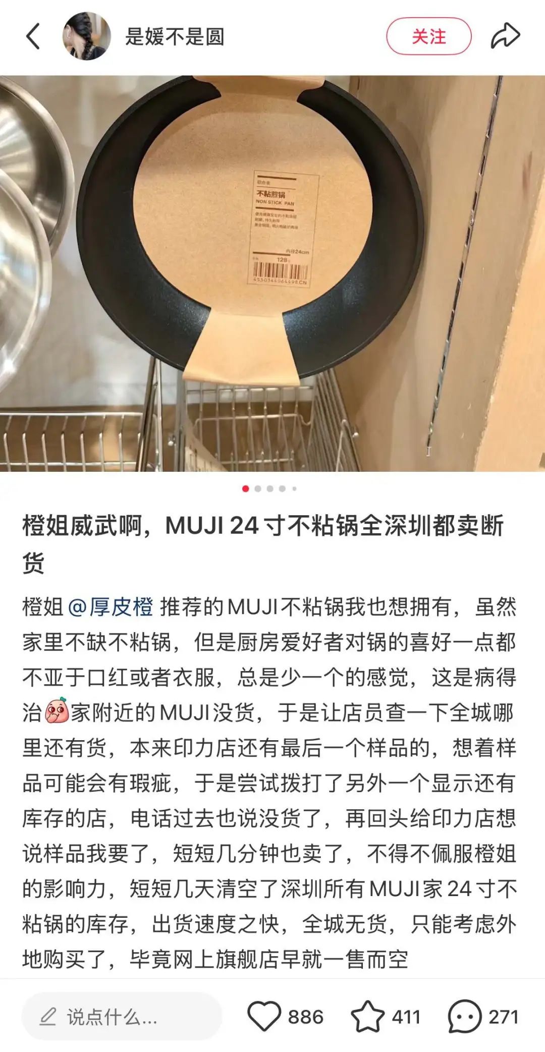 当“厚皮橙”承认视频中出镜率最高的无印良品来自无印良品时,几天后,有网友发现深圳所有的无印良品都缺货。