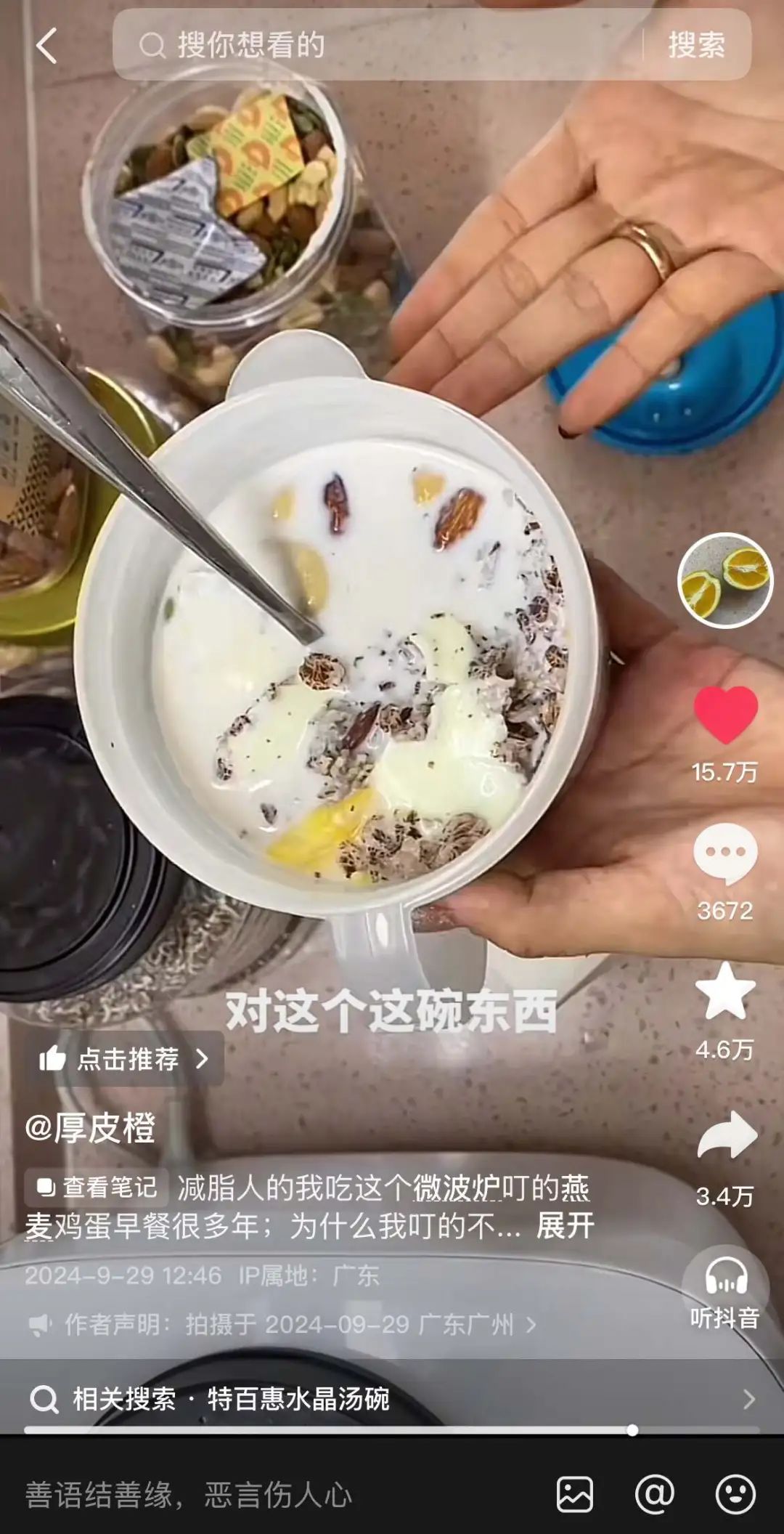 这样的讨论反而推动了话题的热度,让这个燕麦蛋碗在争议中脱颖而出。截至目前,该视频在抖音获得15.7万赞,在小红书获得16.3万赞,是“厚皮橙”抖音和小红书账号的第一个爆款视频。