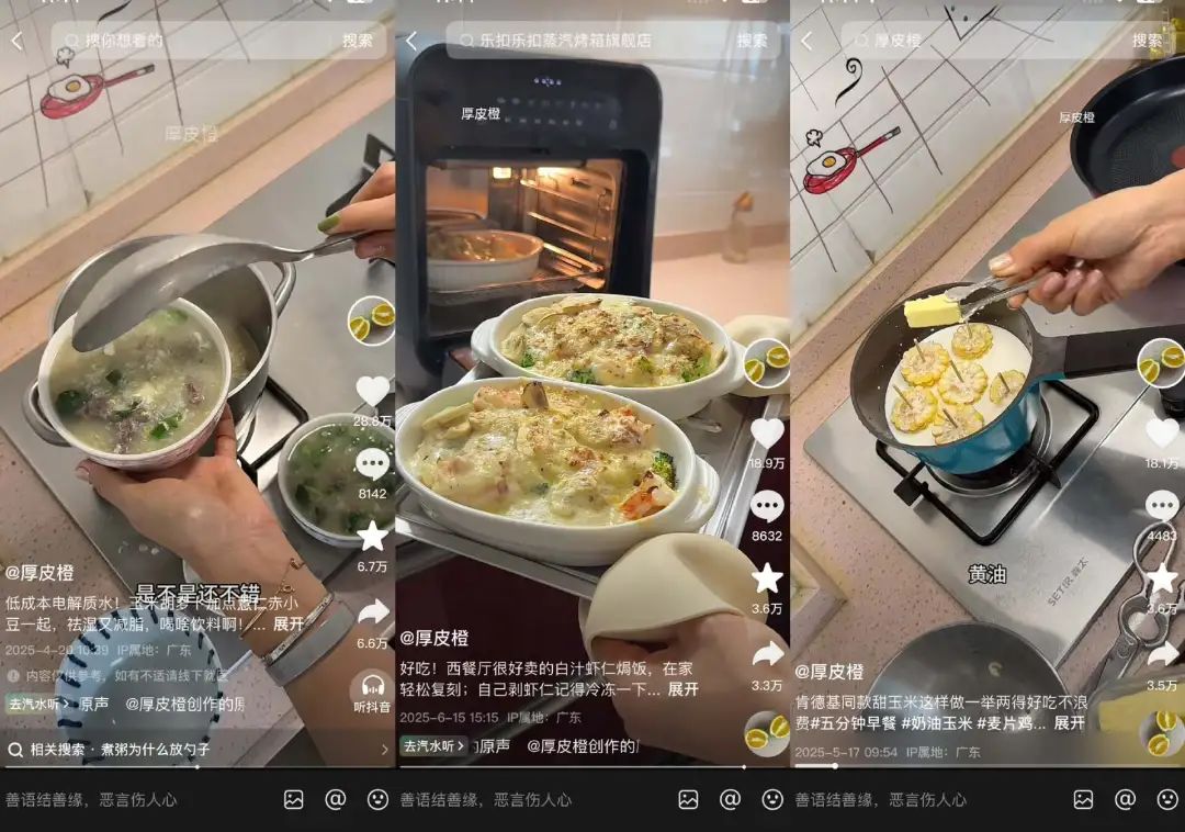 “橘子学家”们紧跟“厚橘子”的步伐,在视频中一一复制她的烹饪过程。他们还学会了用不沾锅做滑蛋,用冷锅炒凉油,再加上“用‘厚橘子’做饭的日子开始了”。;开场白:“自打跟‘厚皮橙’学做饭,厨房油烟少了一半”,仿佛找到了流量密码。