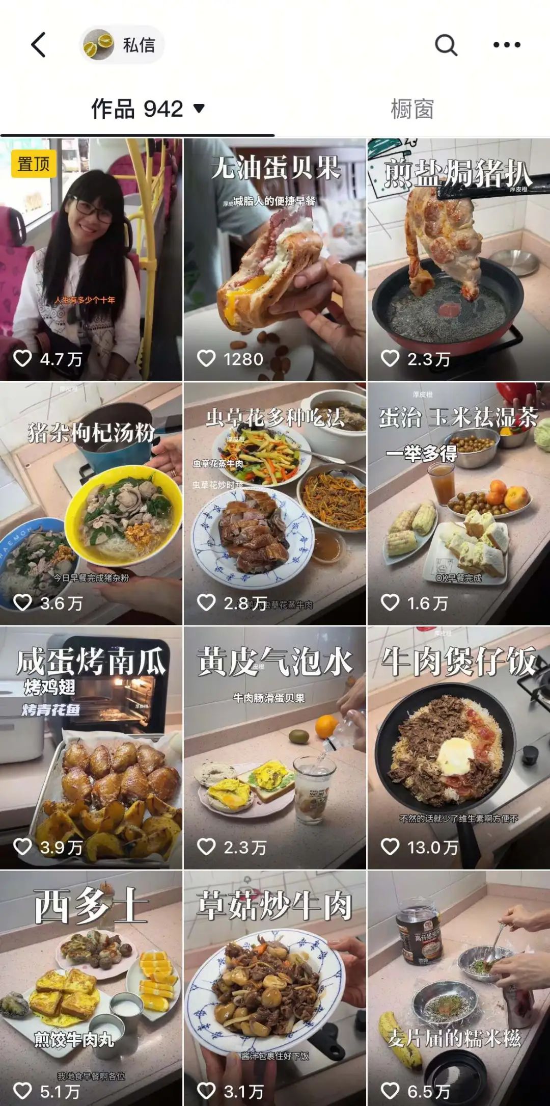 例如被网友称为“主母”、各式各样的食材一锅出来的“注意炫饭”;比如每天教网友一道家常菜,用保姆教程处理“今天吃什么”问题的“村驴”。他们不炫耀自己的技能,只是记录自己的家常菜,却多次获得100多万的爆款作品。