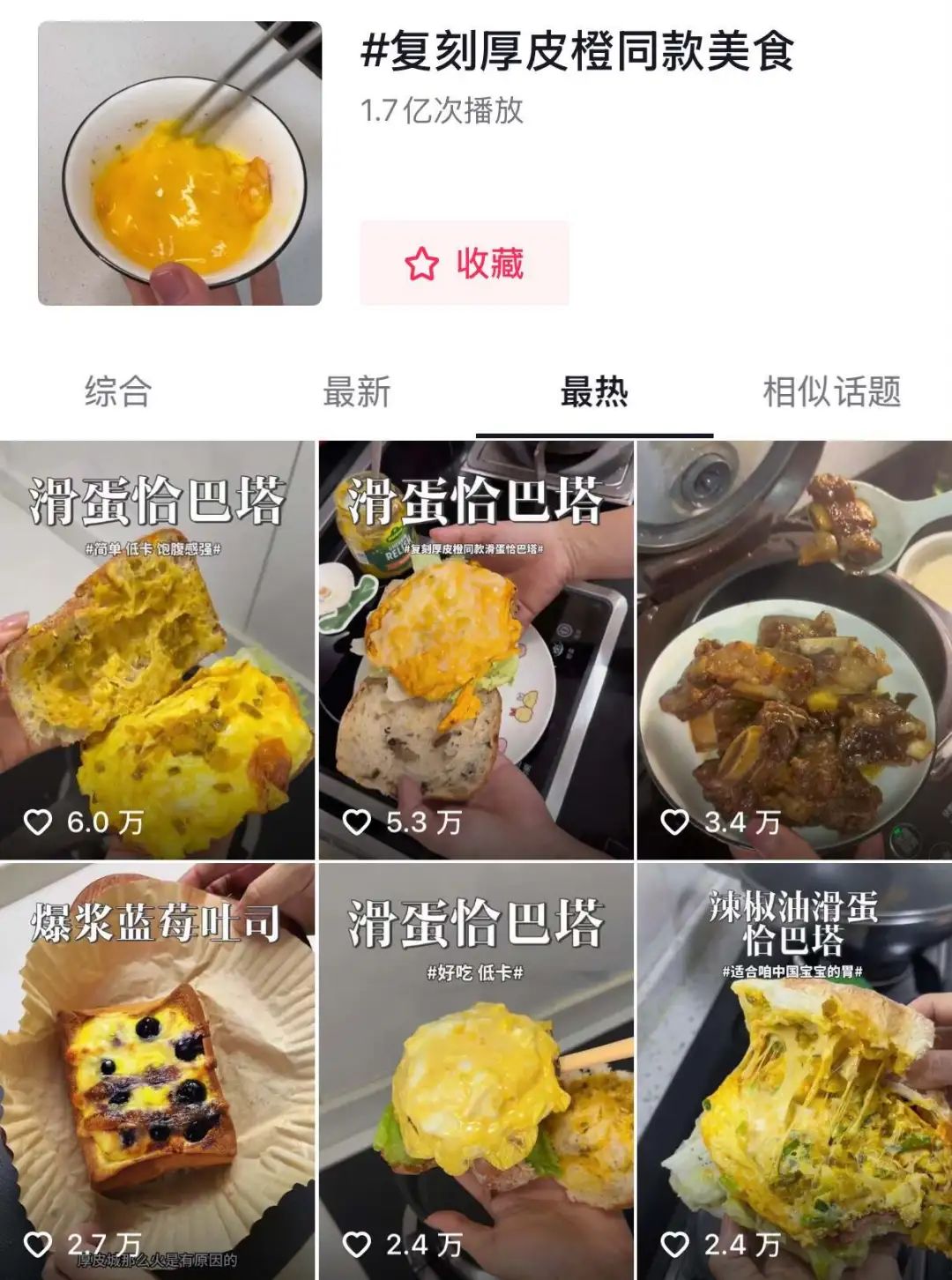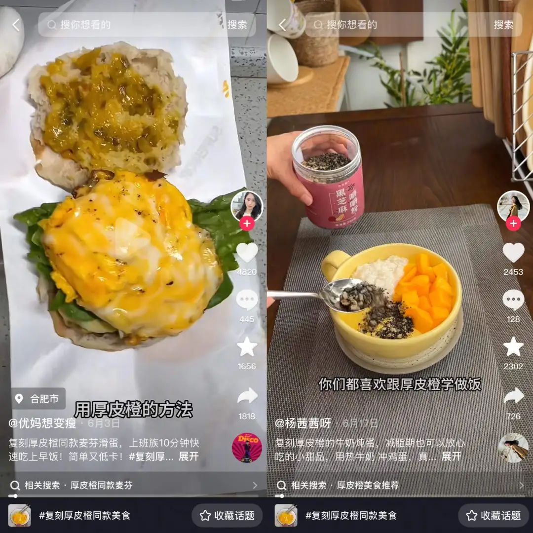 抖音,#跟厚皮橙学做菜#厚皮橙同款冷泡茶 有10多个相关话题,累计播放量超过2亿次,其中最热门话题#复刻厚皮橙同款美食 累计播放量达到1.7亿个。