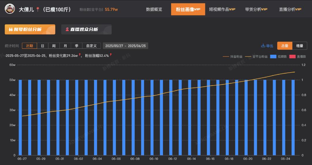 最近30天,新抖数据显示,“大倩儿 ?“已经瘦了100斤)”的抖音账号增加了29万粉丝,现在的粉丝数量是55.8万。