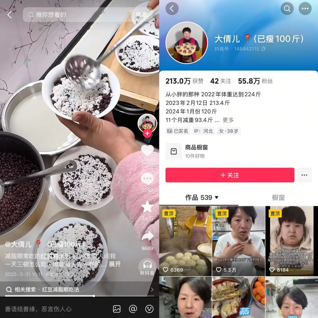 类似于“厚皮橙”的内容风格,“大倩儿 ?(瘦了100斤)”的烹饪视频也推广了“实用主义烹饪”,她曾在视频中表示,通过改变饮食结构,她一年瘦了100斤。就这样,她还会专注于在烹饪视频中分享哪些食物可以满足她的渴望,减少脂肪。