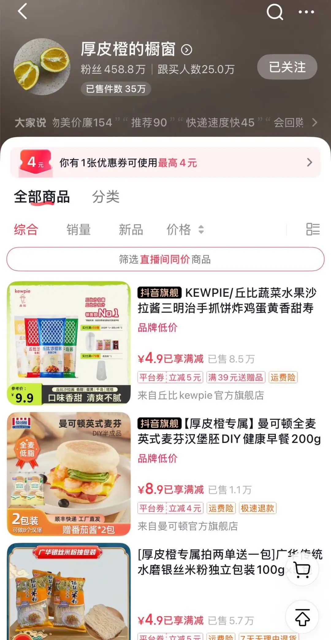 资料显示,“厚皮橙”抖音橱窗已售出35万件商品,与购买人数相比,已达25万件。