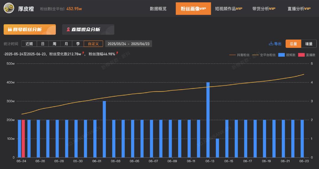 新榜单旗下多平台数据工具显示,近30天来,“厚皮橙”账户在抖音、小红书、Aautorapper、哔哩哔哩等平台上累计增粉239万,目前全网累计粉丝587万,其中抖音粉丝数量最多,达到452万。