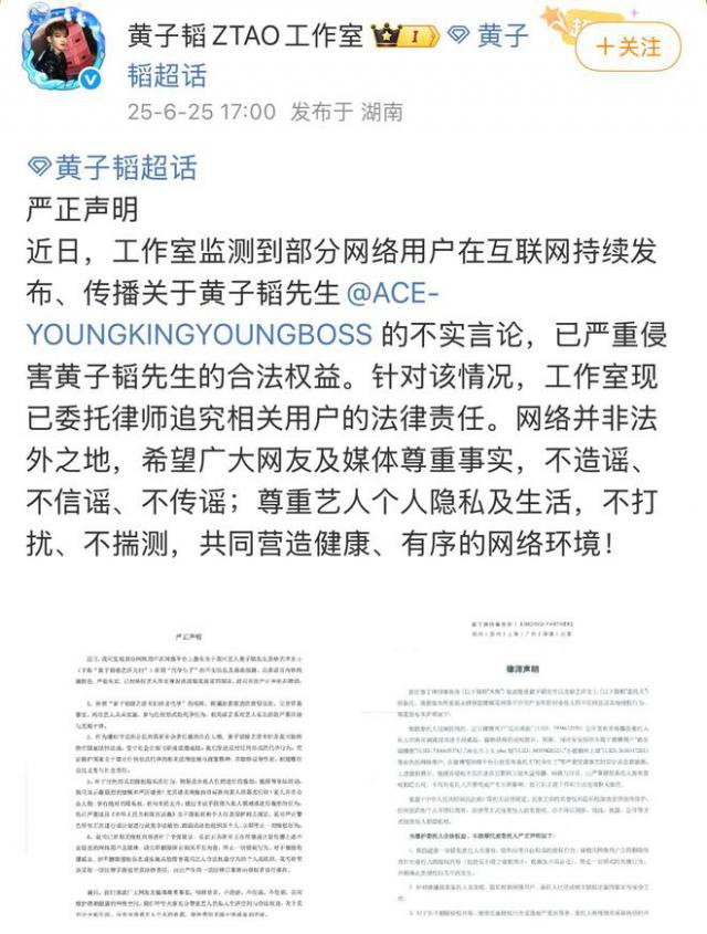 黄子韬工作室发文否认代孕!并且宣布使用法律武器维权。