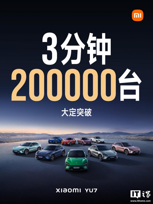 IT 这个世界正式从小米汽车获悉,小米 YU7 汽车 3 分分钟大定突破 20 万台,这个数字可以算是“火箭速度”。
