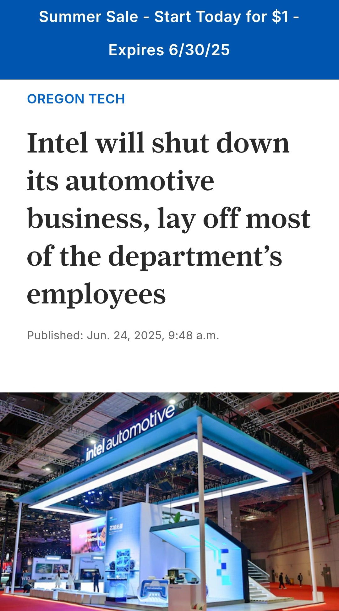 据外媒「Oregonlive」据报道,英特尔将关闭其汽车业务部门,该部门的大部分员工将被裁掉,涉及R&D、工程、项目管理等多个领域的岗位。