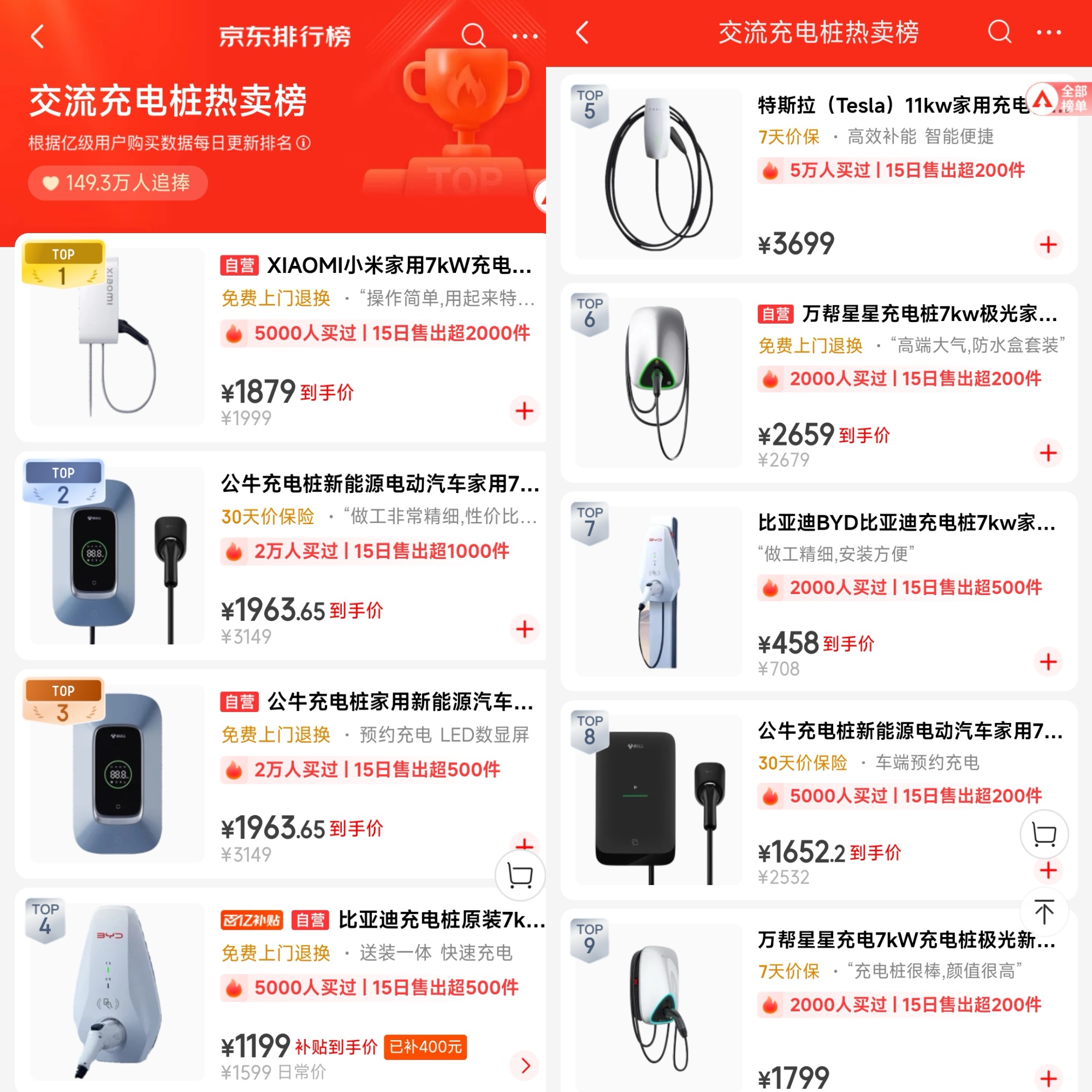 根据JD.COM发布的交流充电桩畅销榜,销量前三的小米充电桩和公牛充电桩价格都在。 1800-2000 在这个范围内,而且特斯拉的价格更高。 11kW 充电桩,万帮星星 7kW 其次是充电桩。