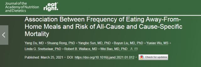 2.Du Y , Rong S , Sun Y ,et al.Association Between Frequency of Eating Away-From-Home Meals and Risk of All-Cause and Cause-Specific Mortality [ J ] .Journal of the American Academy of Nutrition and Dietetics, 2021 ( 3 ) .DOI:10.1016/j.jand.2021.01.012.
