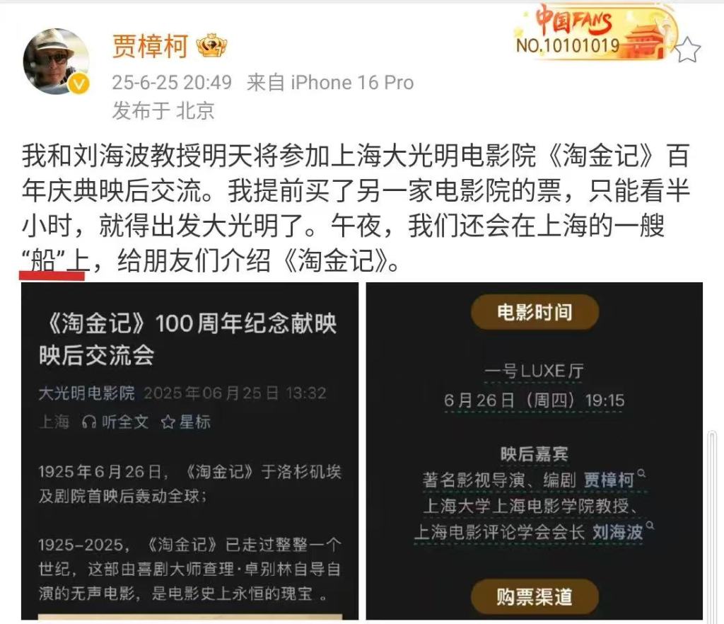6月26日,卓别林《淘金记》上映100周年之际,全球500家影院选择在这一天播出这部经典电影作为纪念品。昨晚7点,上海影院放映了4K修复版《淘金记》,导演贾樟柯到场观看。然而,播出结束后不久,一些同台观众在网上发文指责贾樟柯在电影院用手机拍照。半夜,贾樟柯在微博上发了一条信息,说他在看电影的时候没有拿出手机。