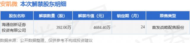 根据市场公开信息,安凯微(688620)于于 6 月 27 日将有 392.0 万股限售股解禁,为公司首发战略配售股份,占公司总股本。 1.0%。(根据历史公告整理了此数据。 , 具体情况以上市公司最新公告为准)近一年内,该股累计解禁。 1.39 亿股,占总股本 35.34%。这次解禁之后,公司还有 1.6 亿股限售股份,占总股本。 40.74%。如图所示:
