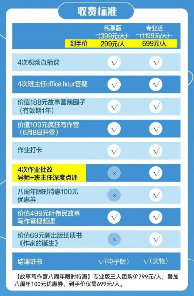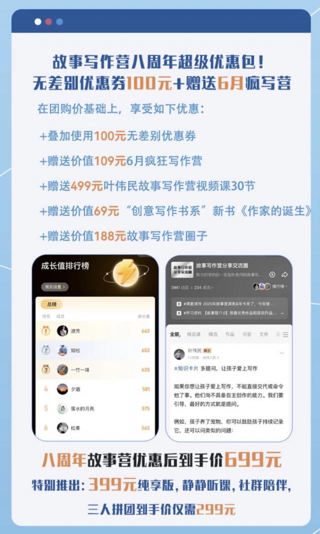 【故事写作营八周年限时特价】专业版三人团购价格 799/ 人类,叠加八周年 100 人民币优惠券,到手价只需要 699/ 人