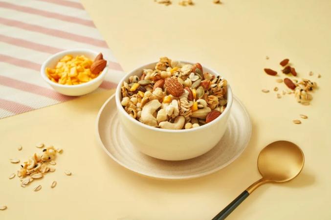 坚果麦片营养成分相对较高,富含维生素、膳食纤维、蛋白质等营养成分,但同样,坚果含油量高,能量也不容小觑。《中国居民膳食指南2022》建议坚果每周摄入量为50。~70克,平均每天摄入量为70克。~10克左右。