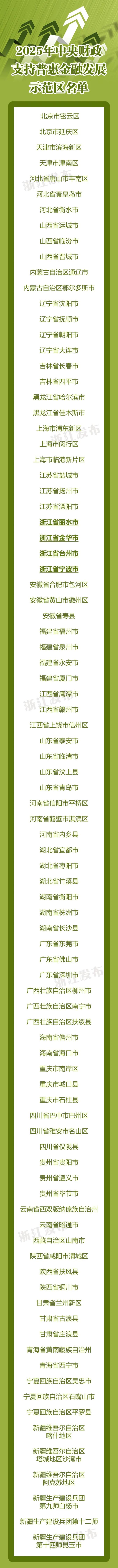 近日,财政部发布通知,公布了2025年中央财政支持普惠金融发展示范区名单,当选90个地区。其中,浙江省丽水市、金华市、台州市、宁波市排名第四。中央政府通过安排奖励和补充资金,支持示范区普惠金融的发展。