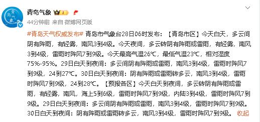 [青岛城区]今日白天,多云间阴有阵雨,有轻雾,南风3-4级。今夜,多云转阴有阵雨或雷雨,有轻雾,南风3-4级,雷雨时阵风7-9级。目前最高温度为26℃,最低温度为23℃,相对湿度为75%-95%。白天到晚上:多云间阴有阵雨或雷雨,南风3-4级,雷雨时7-9级,24-27℃。白天到晚上30天:阴雨或雷雨转多云,南风3-4级,雷雨时阵风7-9级,24-28℃。