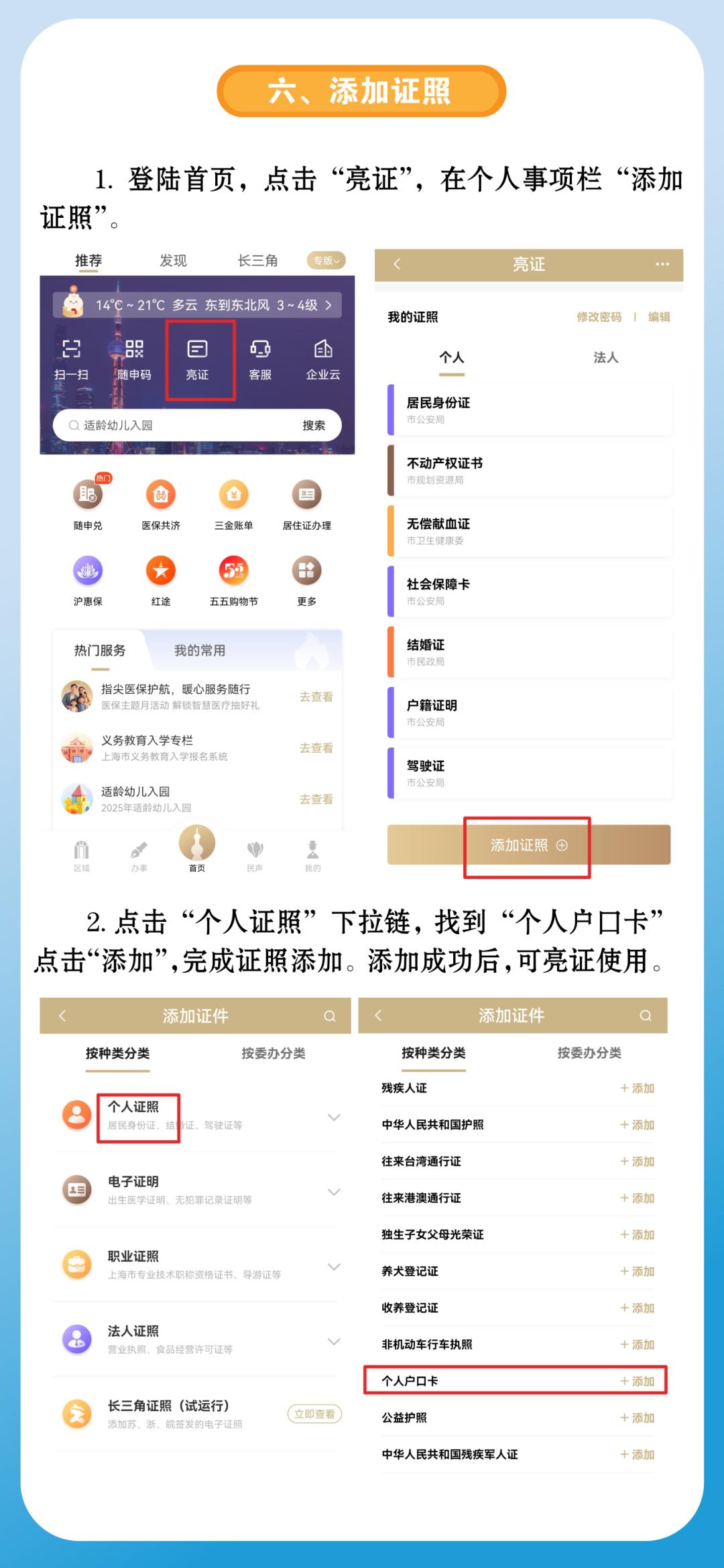 落户受理后,申请人只需登录“随申办”和“亮证”频道添加证件,即可拥有“个人户口卡”电子证照(与实体证件一致),真正实现“零跑动”。