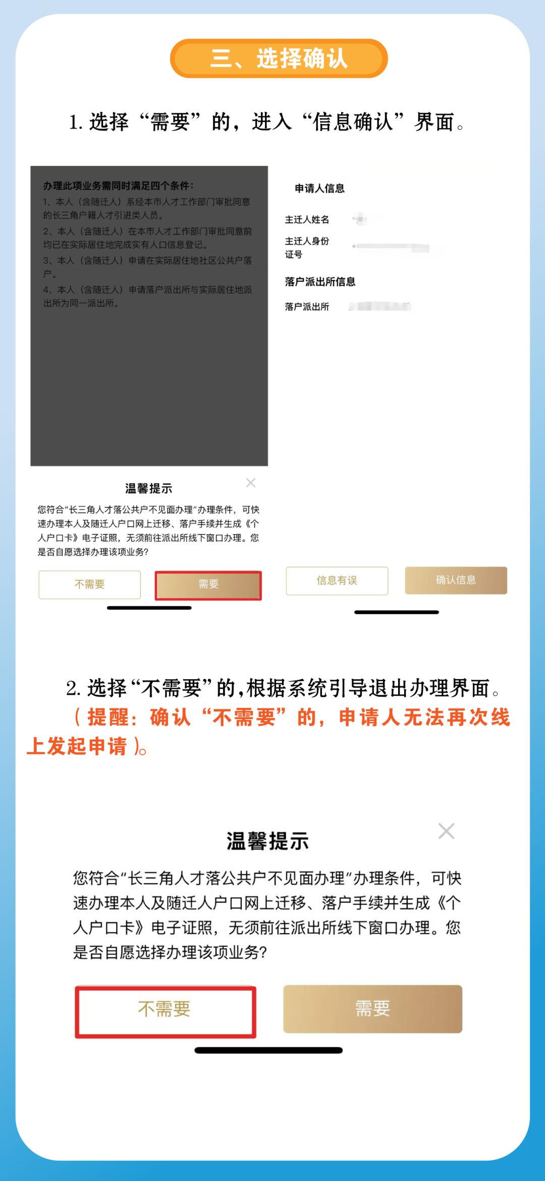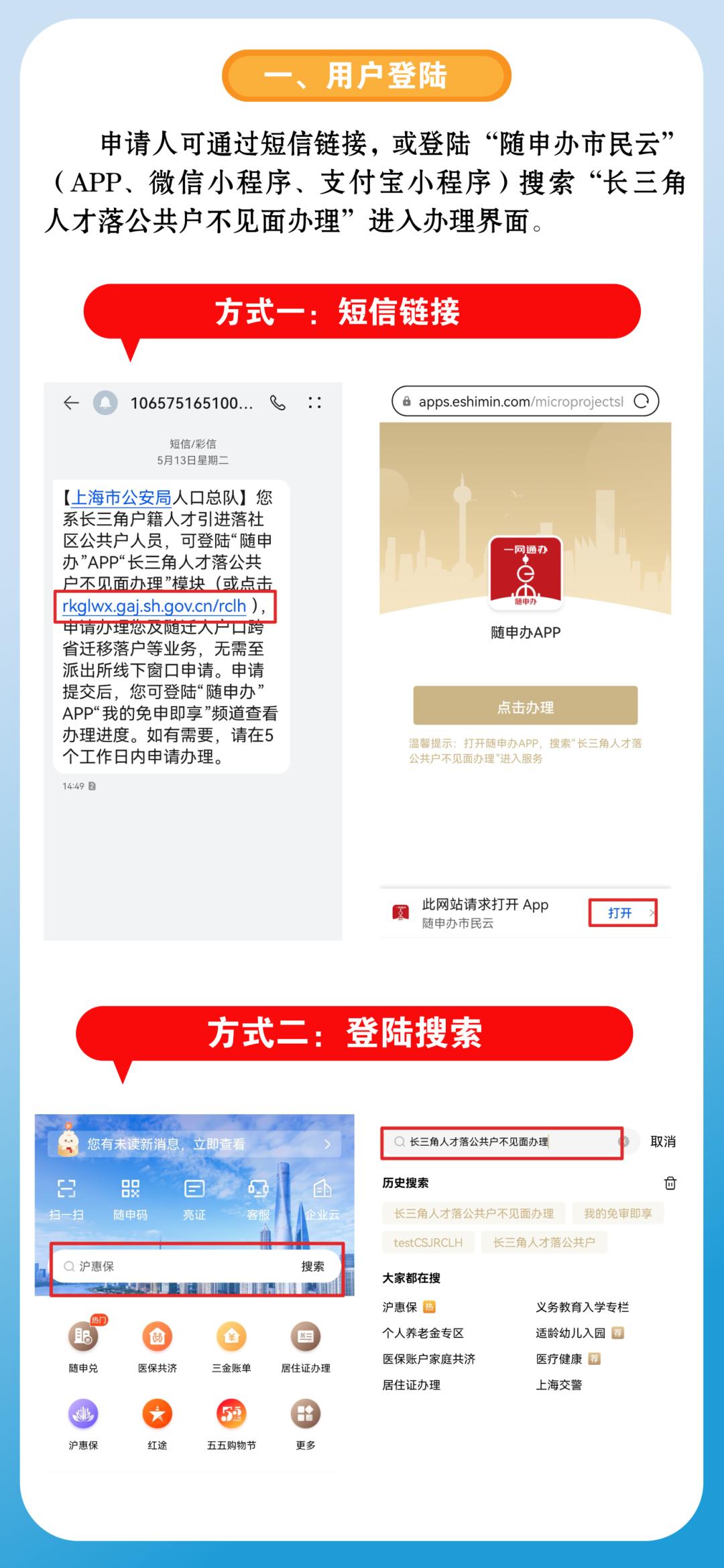 本次便利措施主要服务于苏浙皖三地户籍引进人才及随迁家属,经市人才工作部门批准落户,实际居住地已完成实际人口信息登记并申请在实际居住地社区公共户落户。对上述人员,系统自动抽取数据进行核实,并主动向符合条件的申请人发送提醒信息。申请人收到短信后,可登录“随时申请”(APP或小程序)“长三角人才不会在公共户见面”模块,确定自己和随行家属的个人信息和落户派出所的信息后提交申请。移民派出所收到网上申请后,自动推出户籍网上转移、落户手续、户口卡证件生成等“一站式”服务,全程不见面。