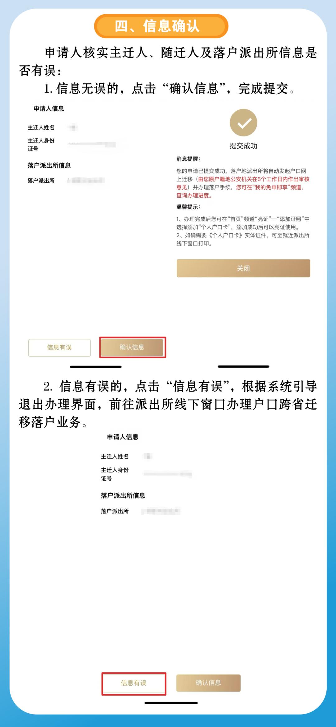 迁入地派出所收到网上申请后,主动发起“跨省户籍网上迁移”,原户籍地派出所迁移后,实现户籍迁移“一地办”。