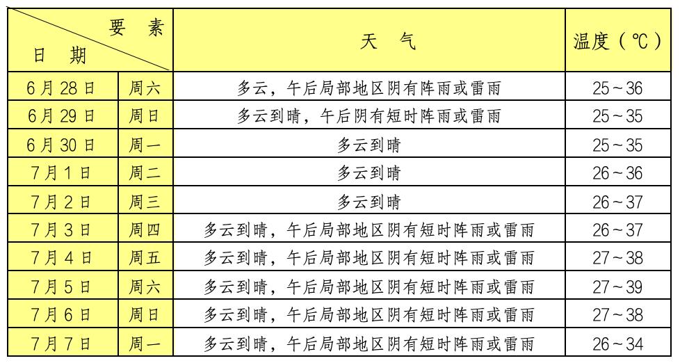 今天梅雨带向东移动,但趋势明显减弱。青浦区位于副热带高压边缘,最高温度可达36℃左右。下午可能会出现雷暴,伴有短期强降水和雷雨。从29日开始,副热带高压明显加强向西延伸,青浦区将出现梅花。未来10天,青浦区将以晴天和热天为主,其中7月初极端最高温度可达39~40℃。具体预报如下: