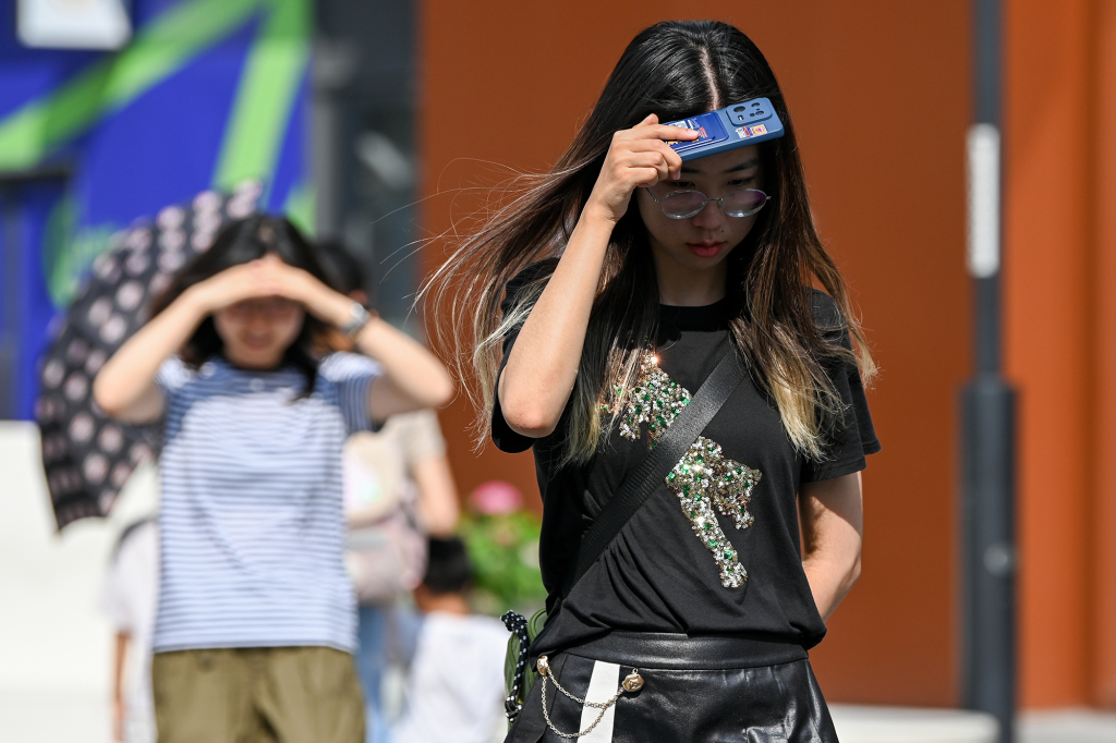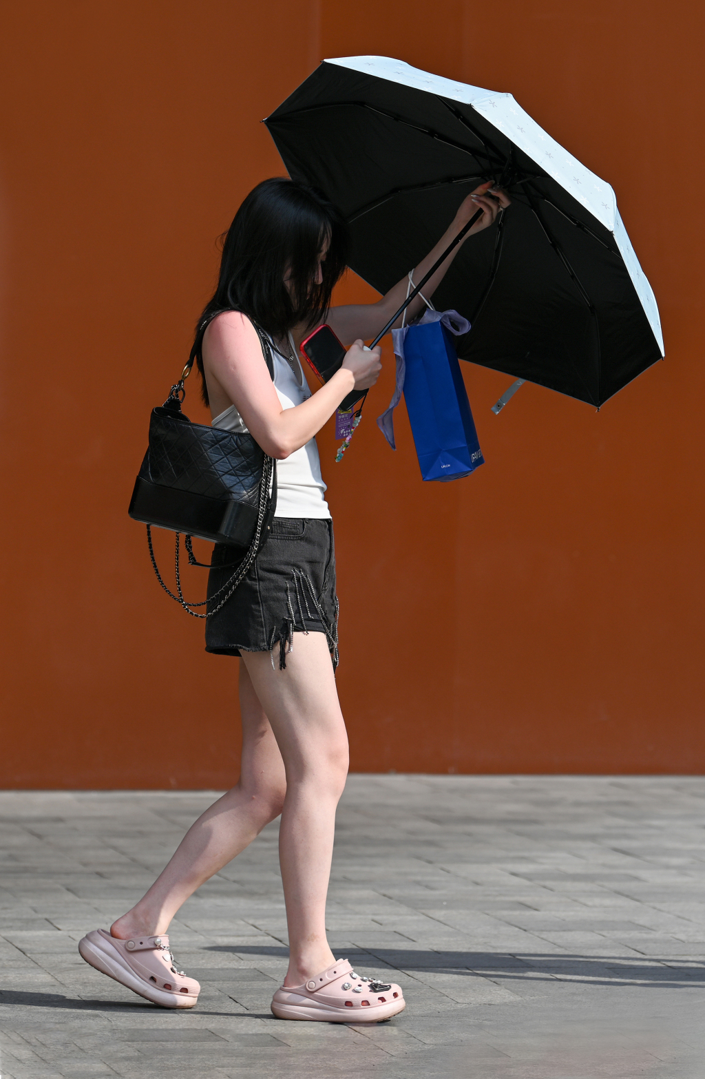 2025年6月27日,上海,行人用手机遮挡阳光。本报记者 朱伟辉 图