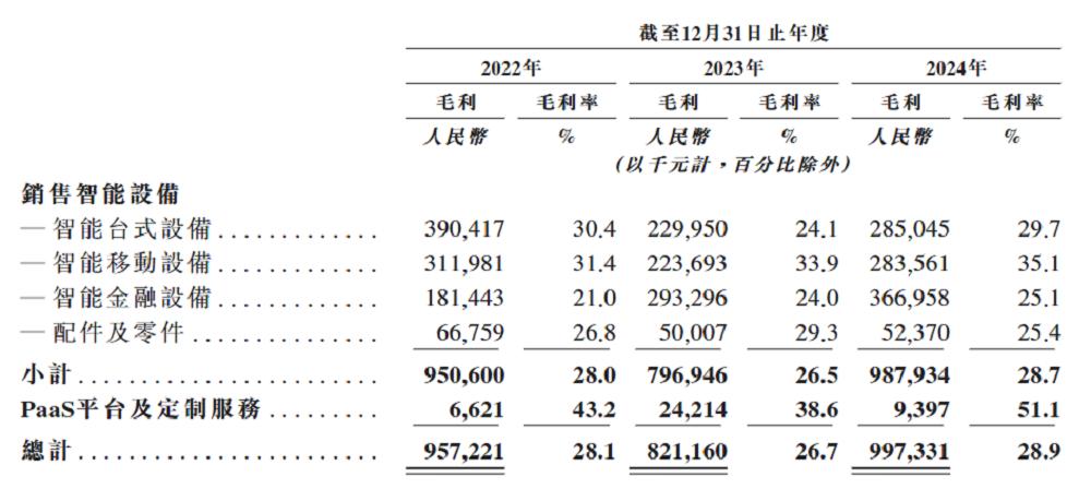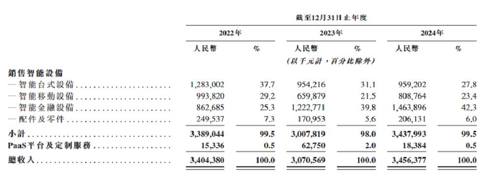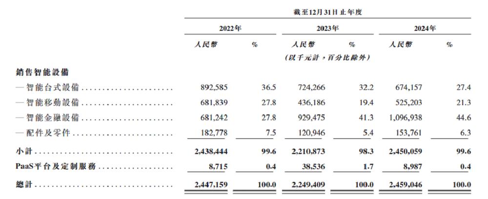 商米科技的大部分收入来自于智能产品的销售。从2022年到2024年,这些业务对其年收入的贡献分别达到99.5%。、98%和99.5%。