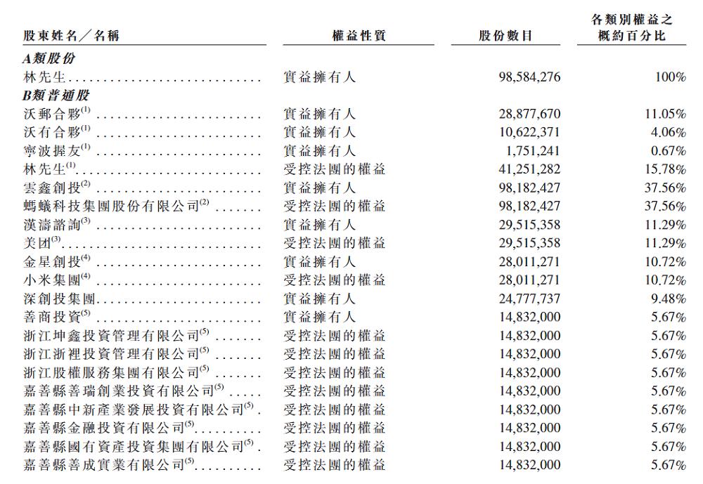 蚂蚁集团在商米科技的B类普通股中持有37.56%的股份,美团持有11.29%的股份。、小米的持股比例为10.72%、深圳风险投资的持股比例为9.48%。