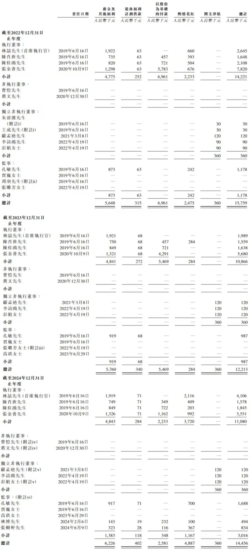 商米科技的高管、董事、监事在2022-2024年以薪酬、花红、股权等方式领取了1576万、1221万、1446万的薪水。