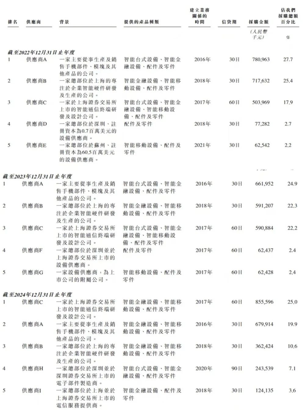 2022-2024年,商米科技前五大供应商的采购额分别为21.4亿元、19.7亿元和22.7亿元,分别占相应年度采购总额的75.9%、74.1%及66.3%;最大供应商的采购金额分别为7.8亿元、6.6亿元和8.6亿元,分别占采购总额的27.7%、24.9%和25.0%。