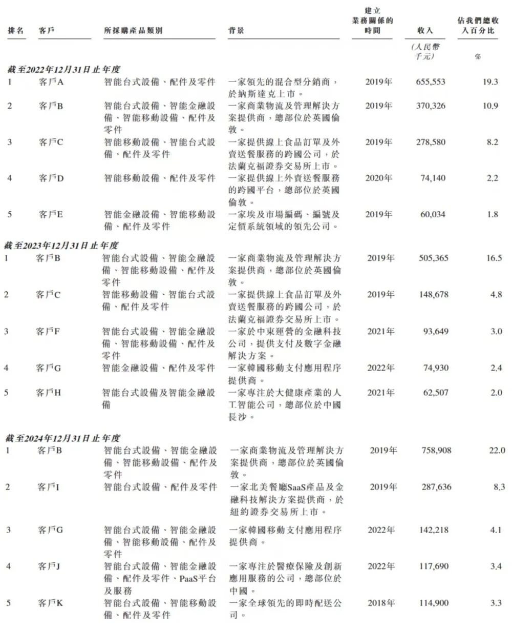 与此同时,商米科技前五大客户的利润分别为14.4亿元、8.9亿元和14.2亿元,分别占今年总收入的42.3%、28.8%及41.1%;最大客户的收入分别为6.6亿元、5.1亿元和7.6亿元,分别占今年总收入的19.3%、16.5%和22.0%。