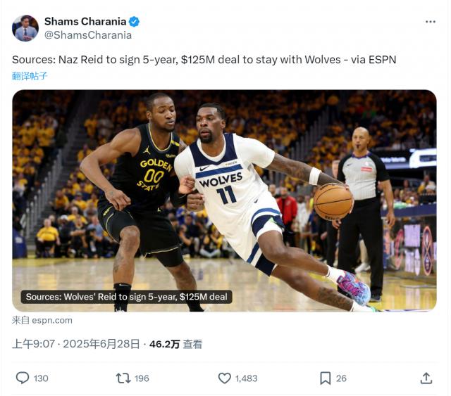 北京时间 6 月 28 日,NBA 名记 Shams 里德拒绝了下赛季的报道。 1500 一万美元的球员选项,与森林狼签约。 5 年 1.25 合同续约1亿美元。这里也是今年休赛期以来第一份超过1亿元的合同。里德没有等待自由市场开放,他想留在这里。