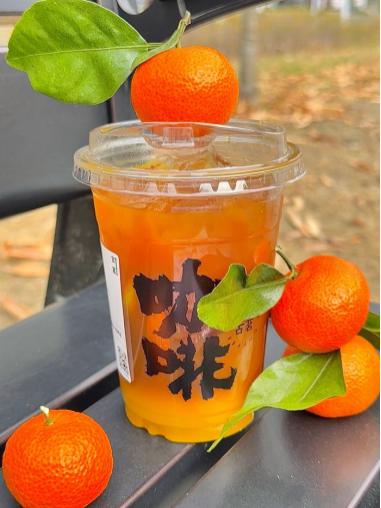 同样的果咖,古茶注入大橘美式风格。 HPP 橘汁(1L 橘汁≈ 24 新鲜水果),另一款爆款“冰咖小白柚”也融合了茶饮元素。