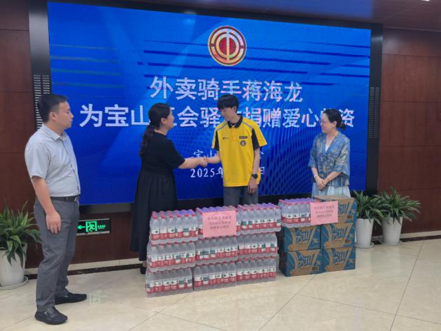 最近,宝山工会发布了一份“爱心冰箱”的招聘令。那天晚上,外卖小哥蒋海龙联系了对接人员,向工会栈捐赠。 10 箱矿泉水和 5 箱式饮料,用实际行动传达爱与善意,展现平凡岗位的非凡力量。