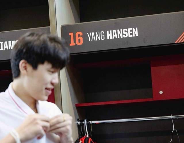 在新闻发布会上,杨瀚森还举着球衣与比卢普斯、总经理合影,这也将成为杨瀚森职业生涯的标志性画面。